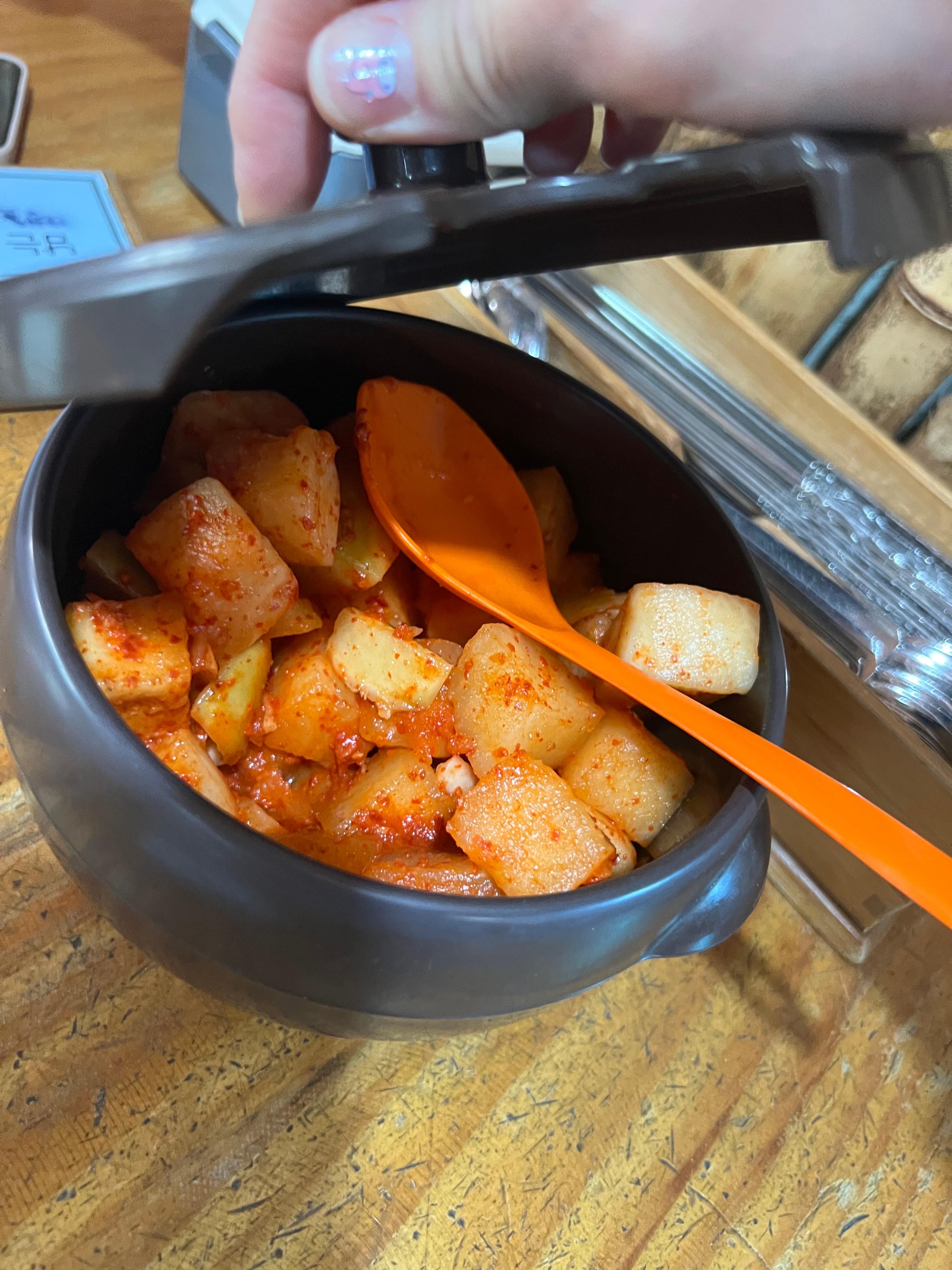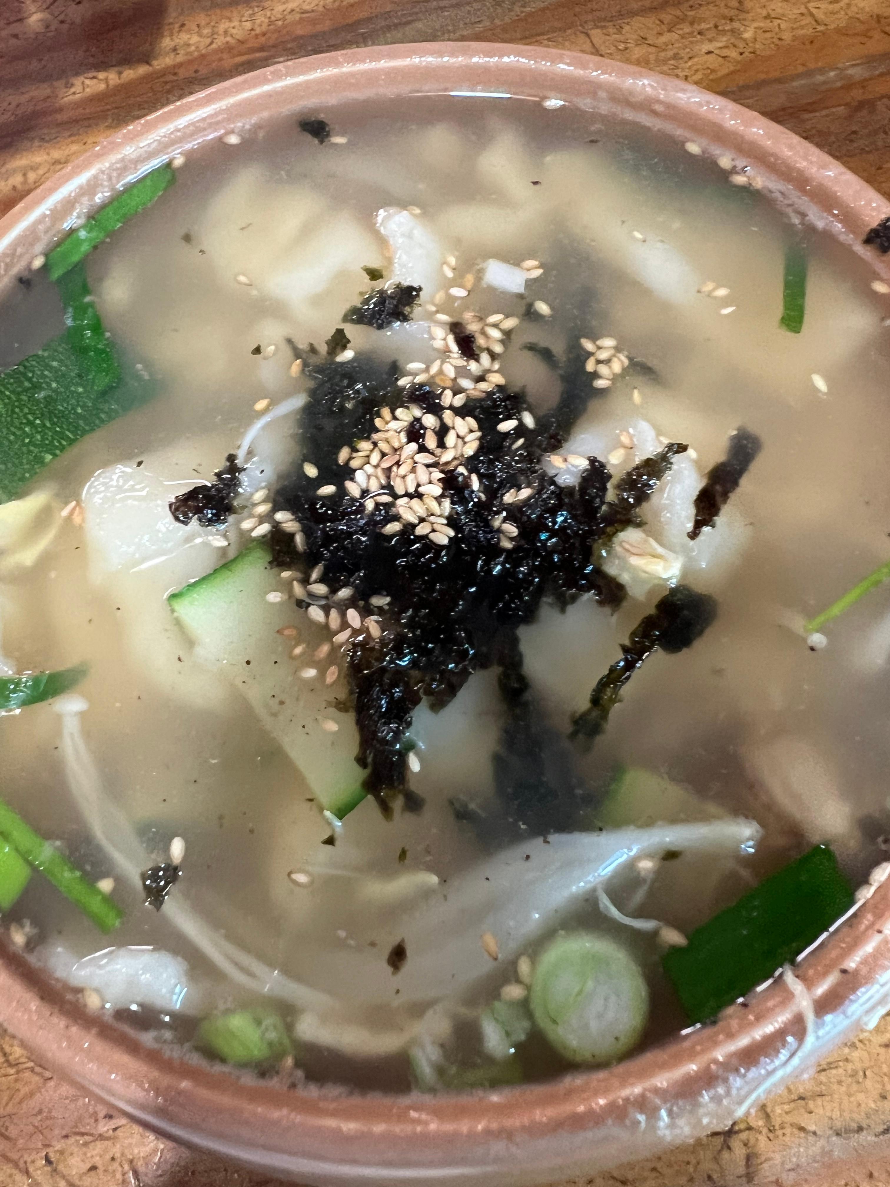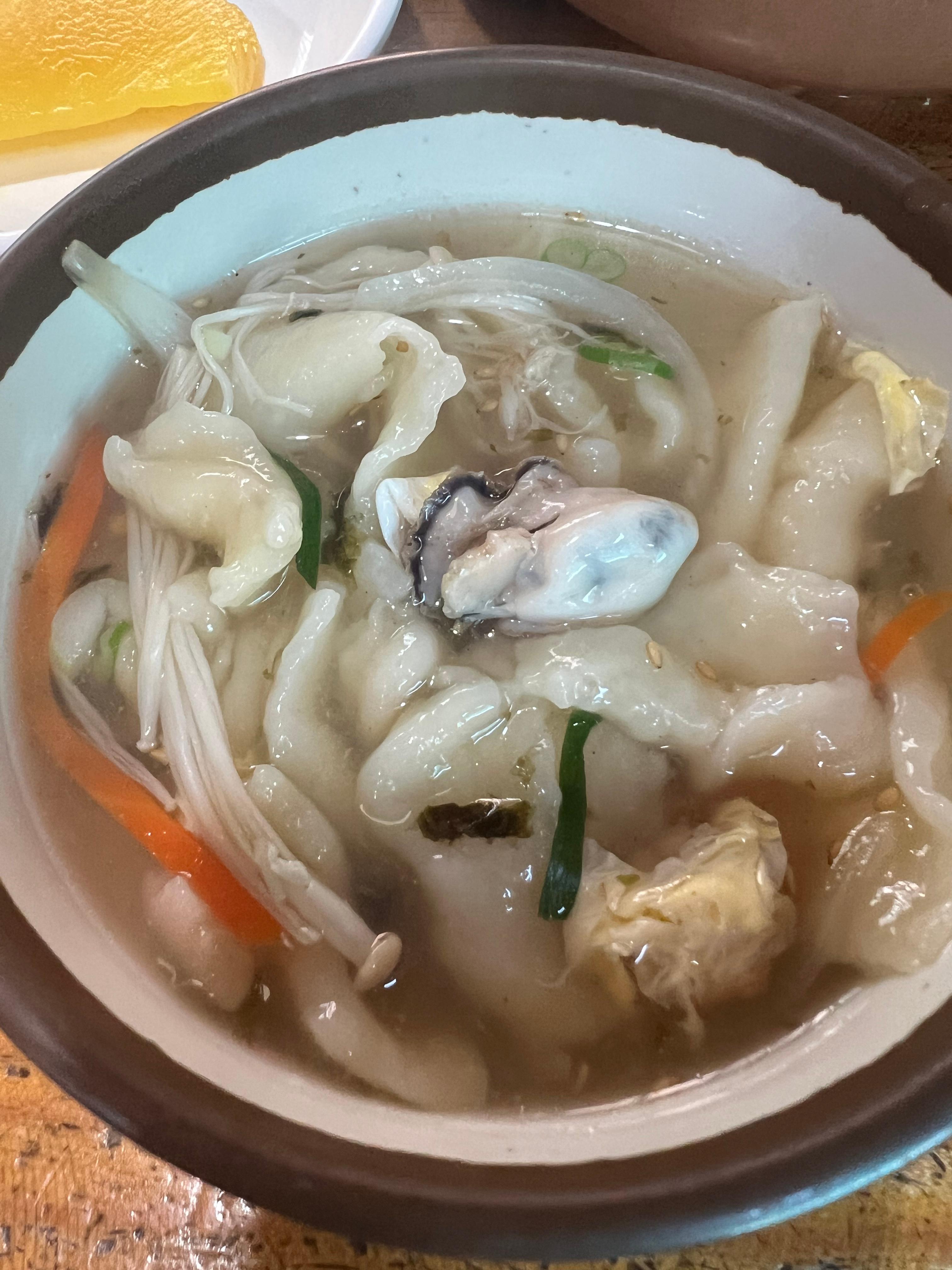 전통적인 항아리에 담겨 나오는 수제비는, 해산물 육수의 깊은 맛과 쫄깃한 면발이 특징입니다. 굴, 새우, 오징어, 조개 등 다양한 해산물이 풍부하게 들어가 있어 국물의 깊은 맛을 더합니다. 한 그릇으로도 충분한 포만감을 느낄 수 있습니다.