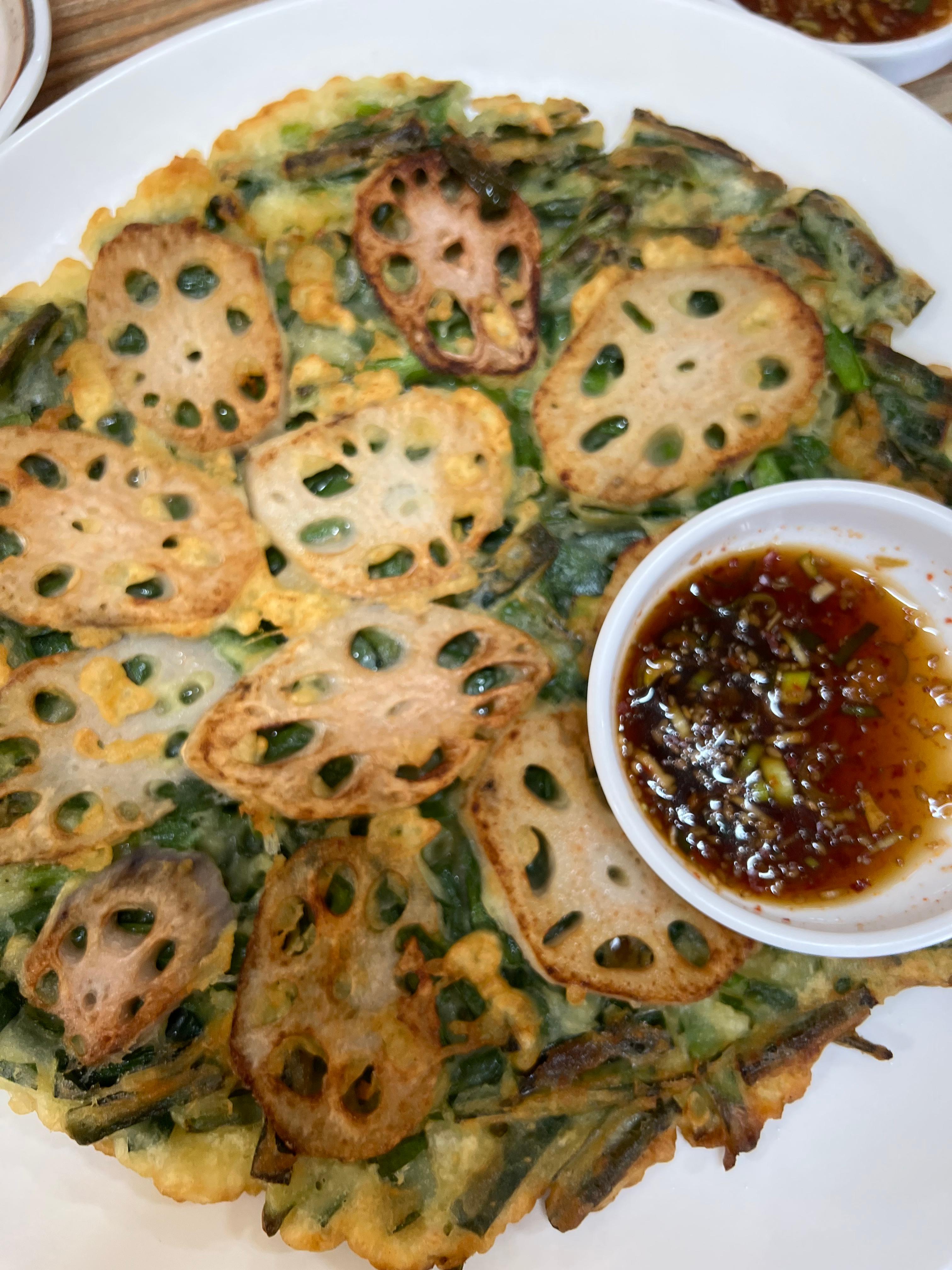 연근이 듬뿍 들어간 부침개는 부추의 향과 함께 고소한 맛이 일품입니다. 노릇하게 구워진 부침개를 간장에 찍어 먹으면 더욱 맛있습니다.
