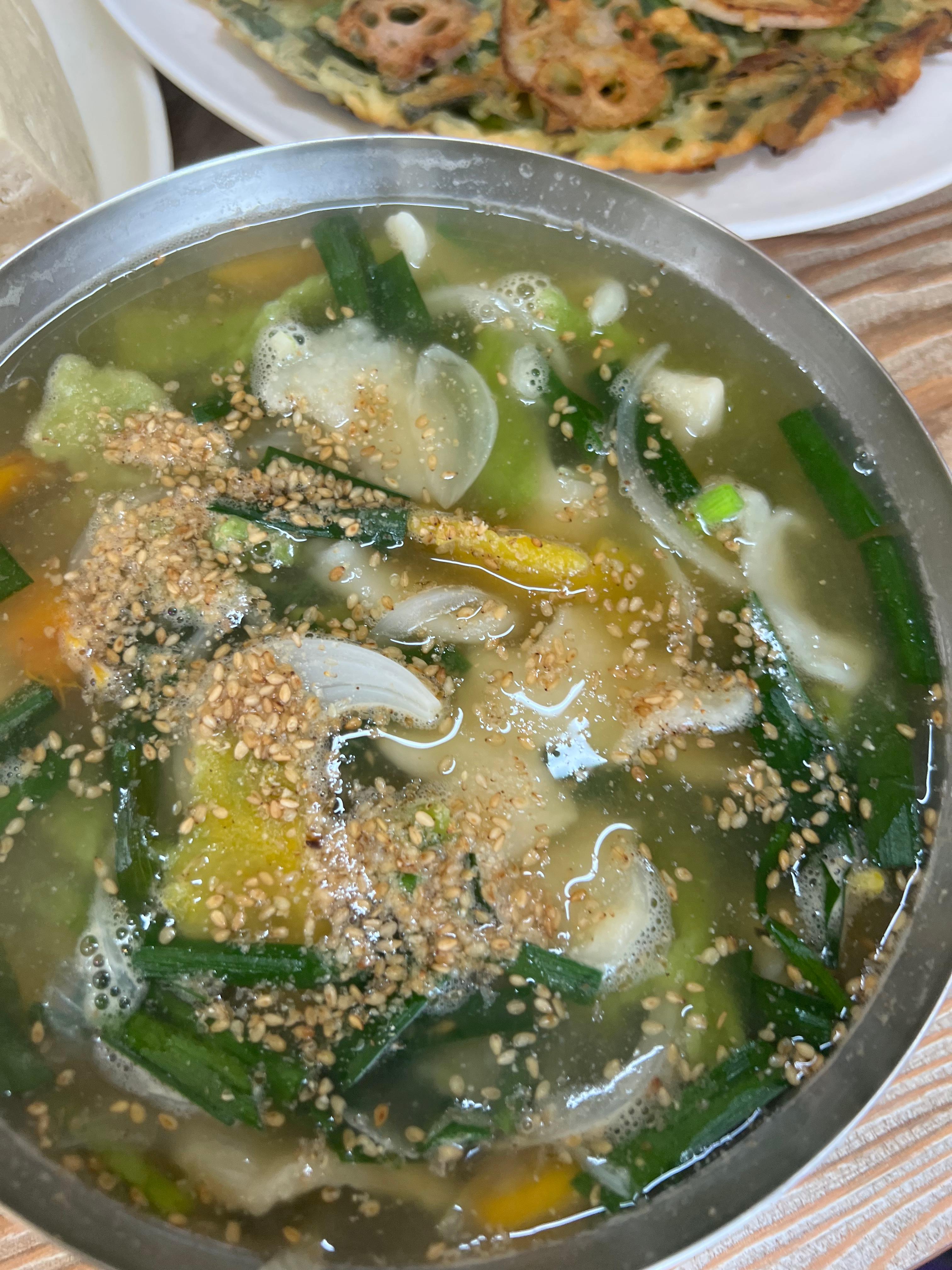 연잎이 들어간 쫄깃한 수제비는 국물이 깔끔하고 시원하여 추운 날씨에 제격입니다. 호박과 양파가 들어가 자연스러운 단맛이 느껴지며, 양도 푸짐하여 가성비가 뛰어납니다.