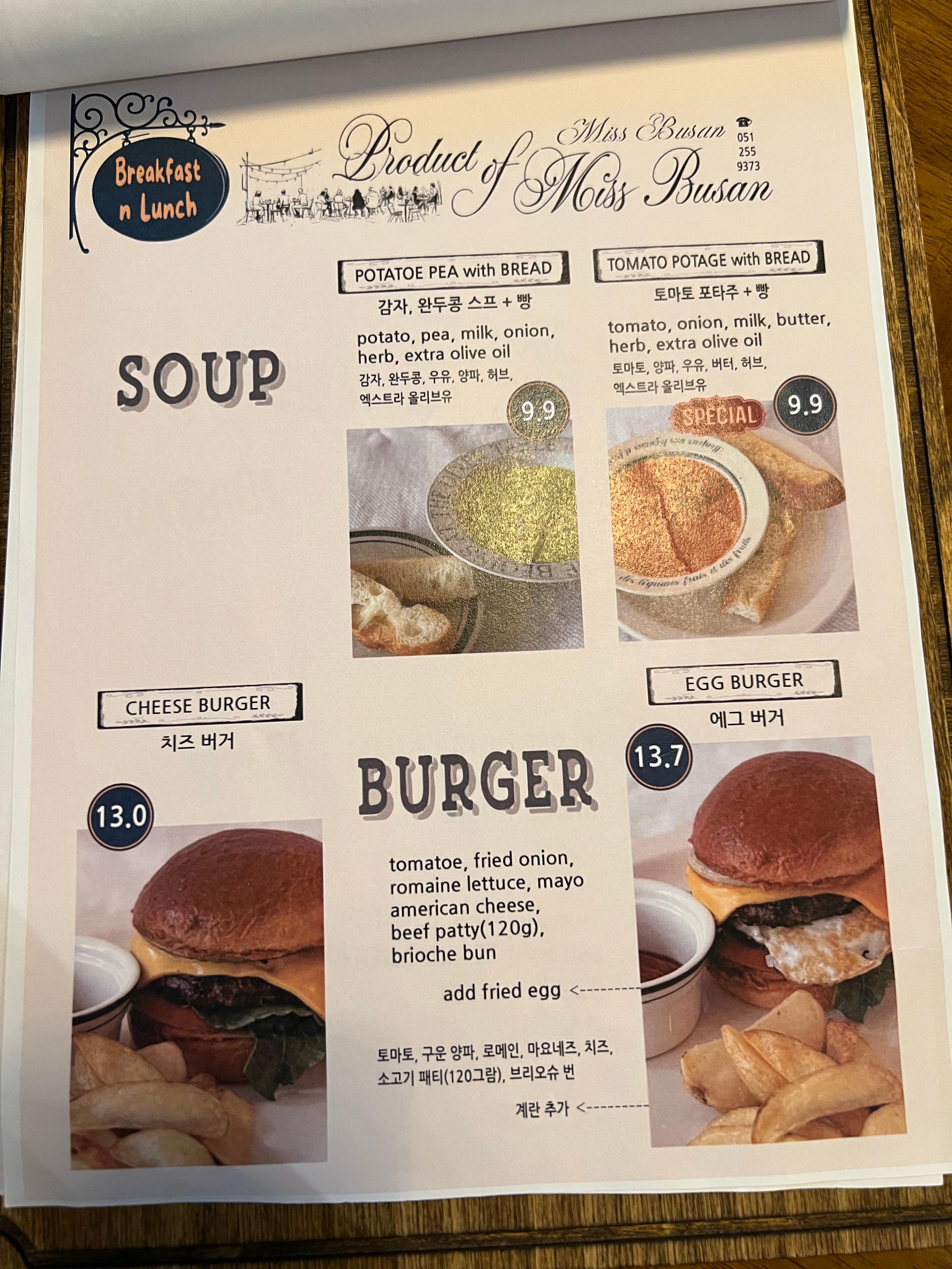 | 감자완두콩스프 | 따뜻하고 부드러운 수프, 치아바타 포함 | 9,900원 |