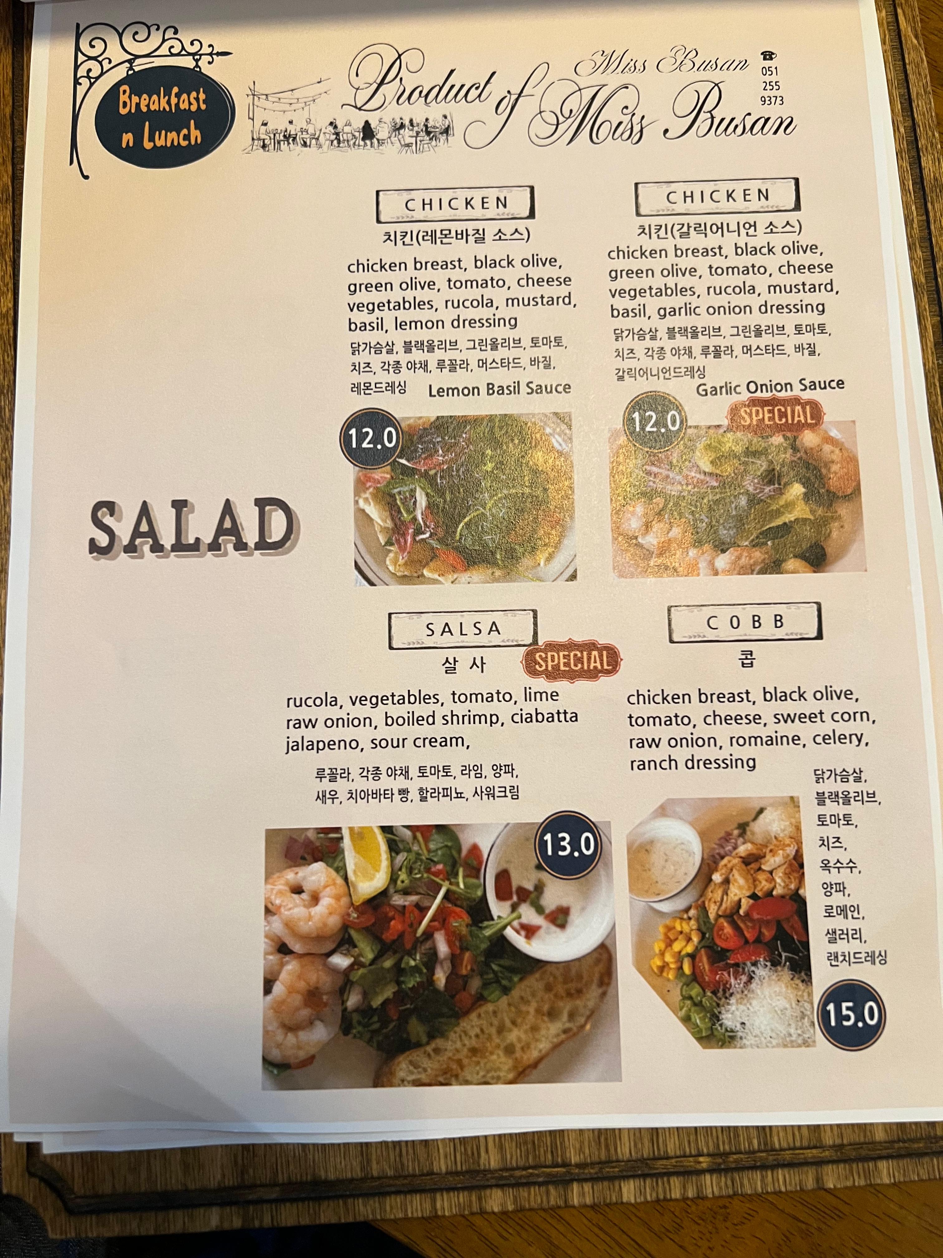 | 콥샐러드 | 다양한 재료가 조화를 이루는 풍성한 샐러드 | 15,000원 |