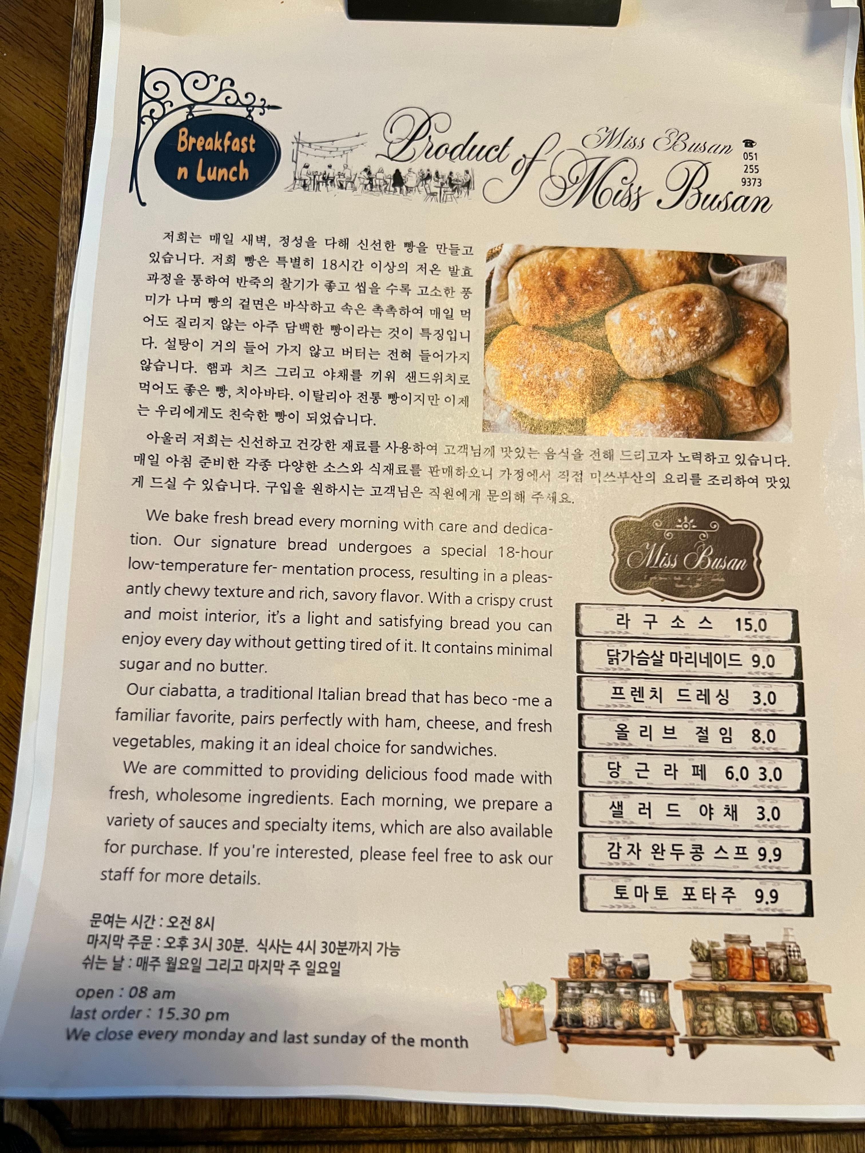 - 영업시간: 08:00 ~ 15:30 (매주 일요일 정기휴무)