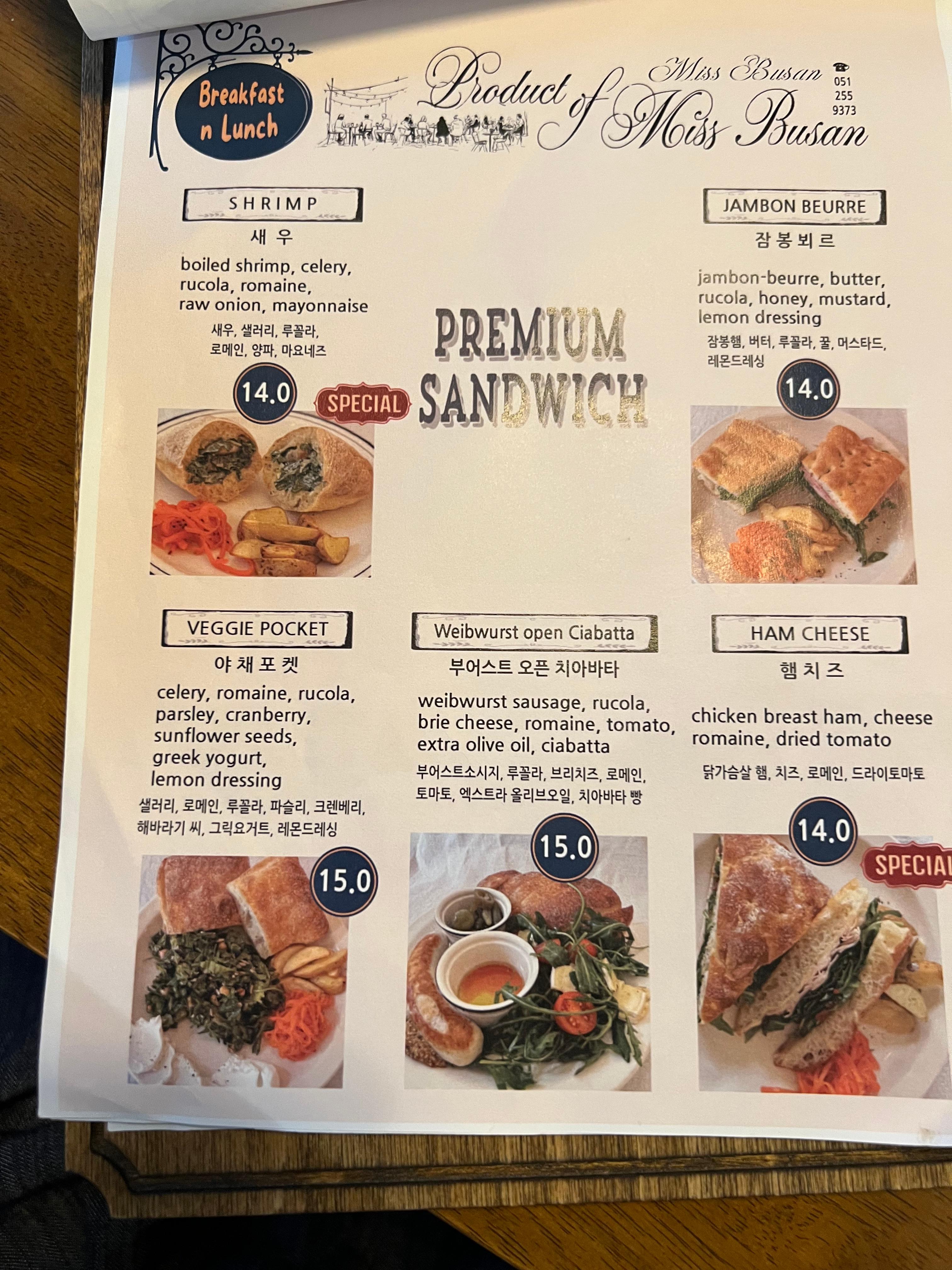 | 잠봉뵈르샌드위치 | 프랑스식 햄과 버터가 어우러진 전통 샌드위치 | 14,000원 |
