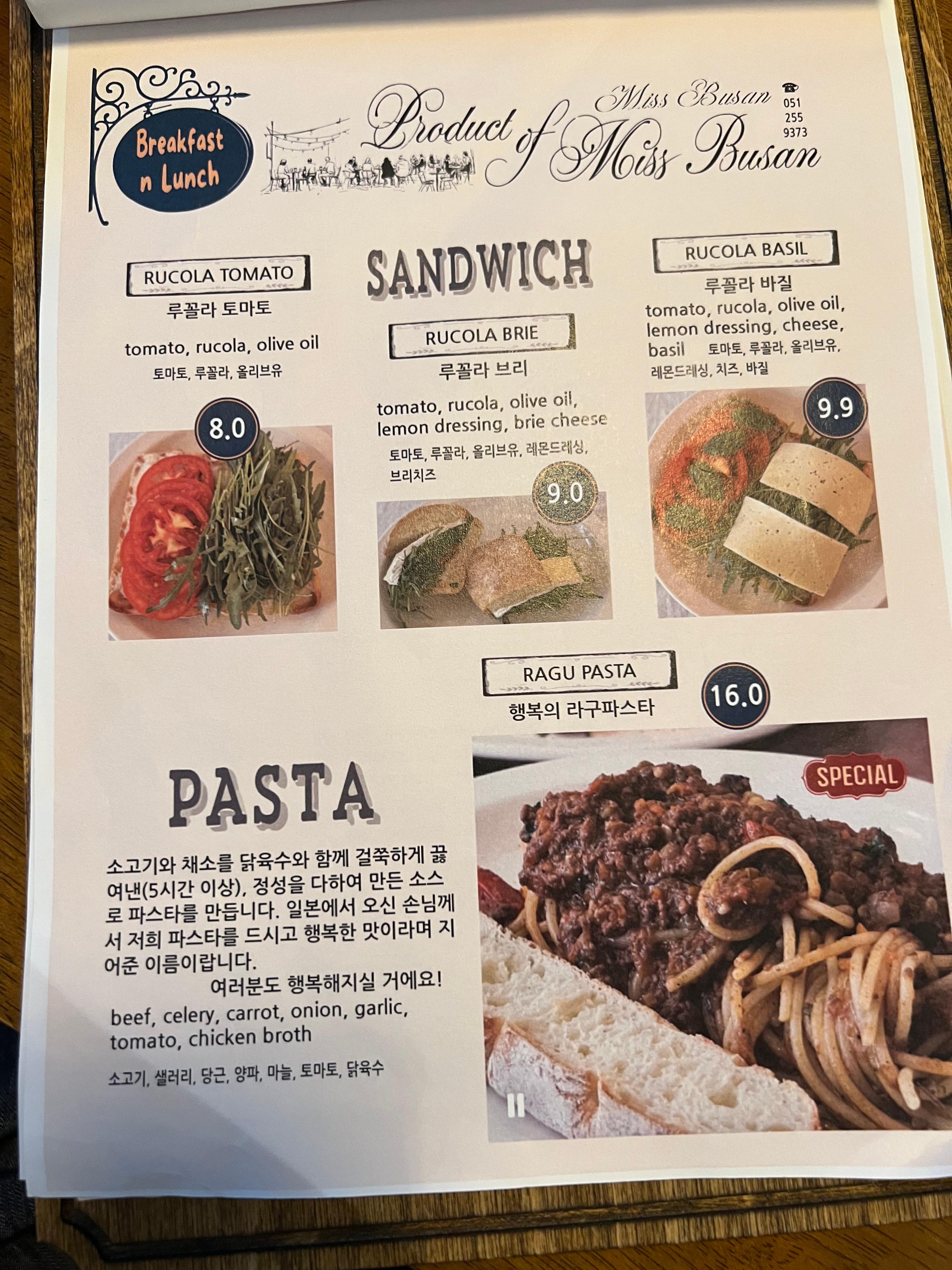 미쓰부산은 샌드위치, 샐러드, 스프 등 다양한 브런치 메뉴를 제공합니다. 특히 토마토 포타주와 새우 샌드위치는 신선한 재료와 풍부한 맛으로 인기 메뉴입니다. 또한, 라구 파스타와 프렌치 치킨 샐러드도 많은 이들의 추천을 받고 있습니다.