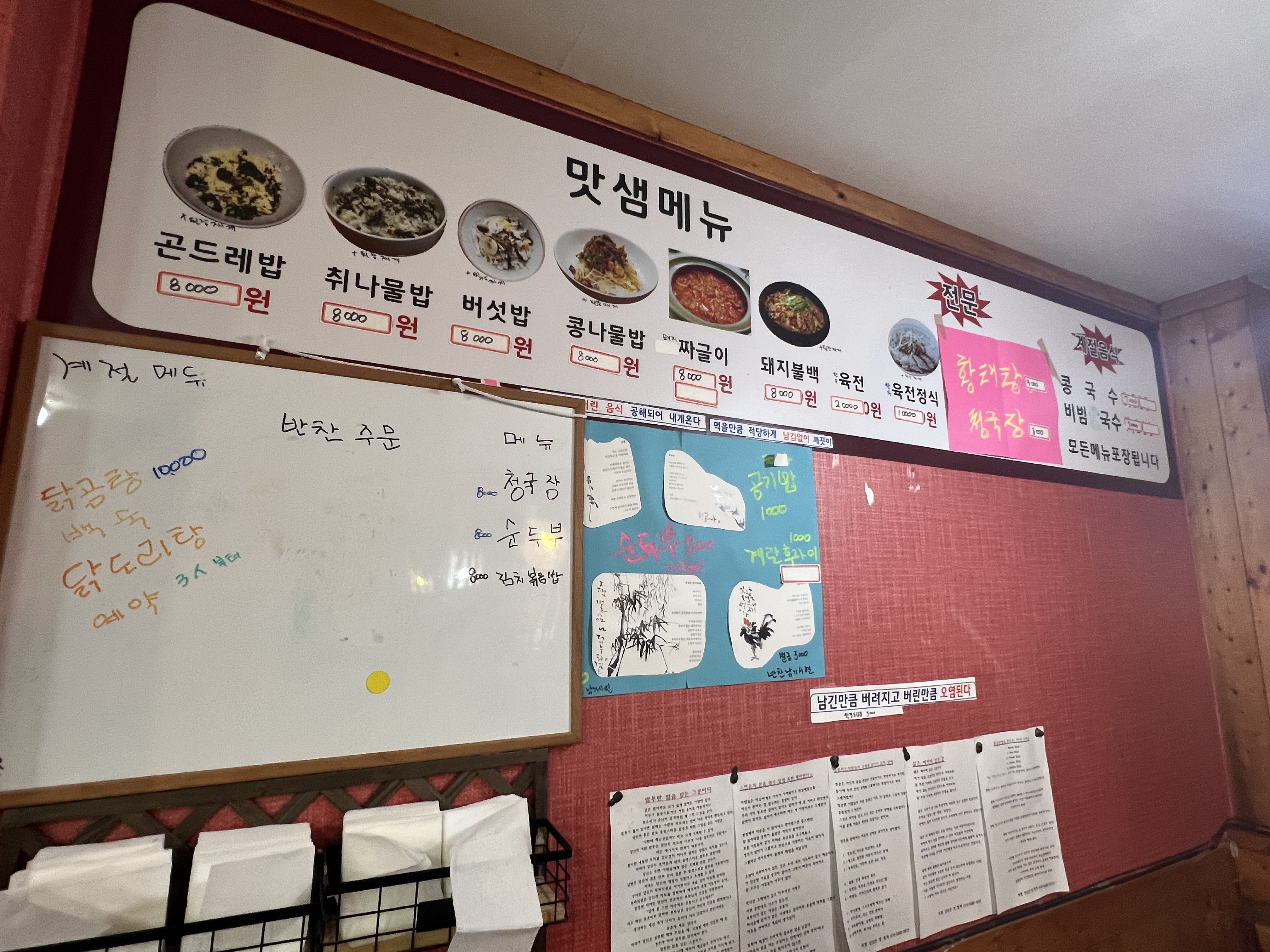 '맛샘'은 사장님 혼자 운영하는 1인 식당으로, 아담한 규모지만 정감 있는 분위기가 인상적입니다. 단골 손님들이 많아 식사 후 직접 계산하고 나가는 모습에서 이곳의 신뢰와 친근함을 느낄 수 있습니다. 또한, 몇 년째 가격을 올리지 않고 손님들을 맞이하는 사장님의 따뜻한 마음씨도 이곳을 특별하게 만듭니다.