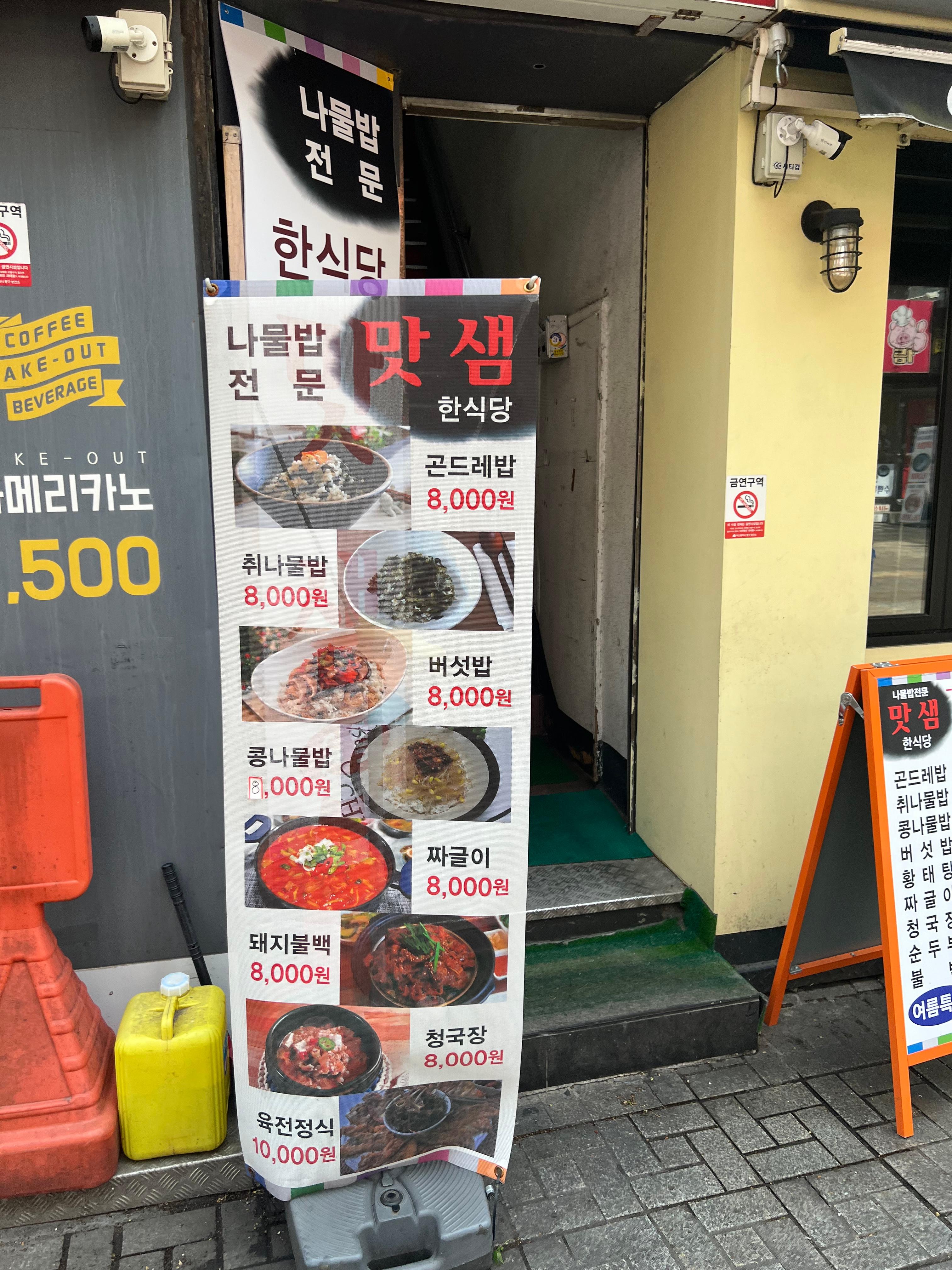 '맛샘'은 다양한 한식 메뉴를 합리적인 가격에 제공합니다. 특히 나물밥과 찌개류, 육전이 인기입니다.