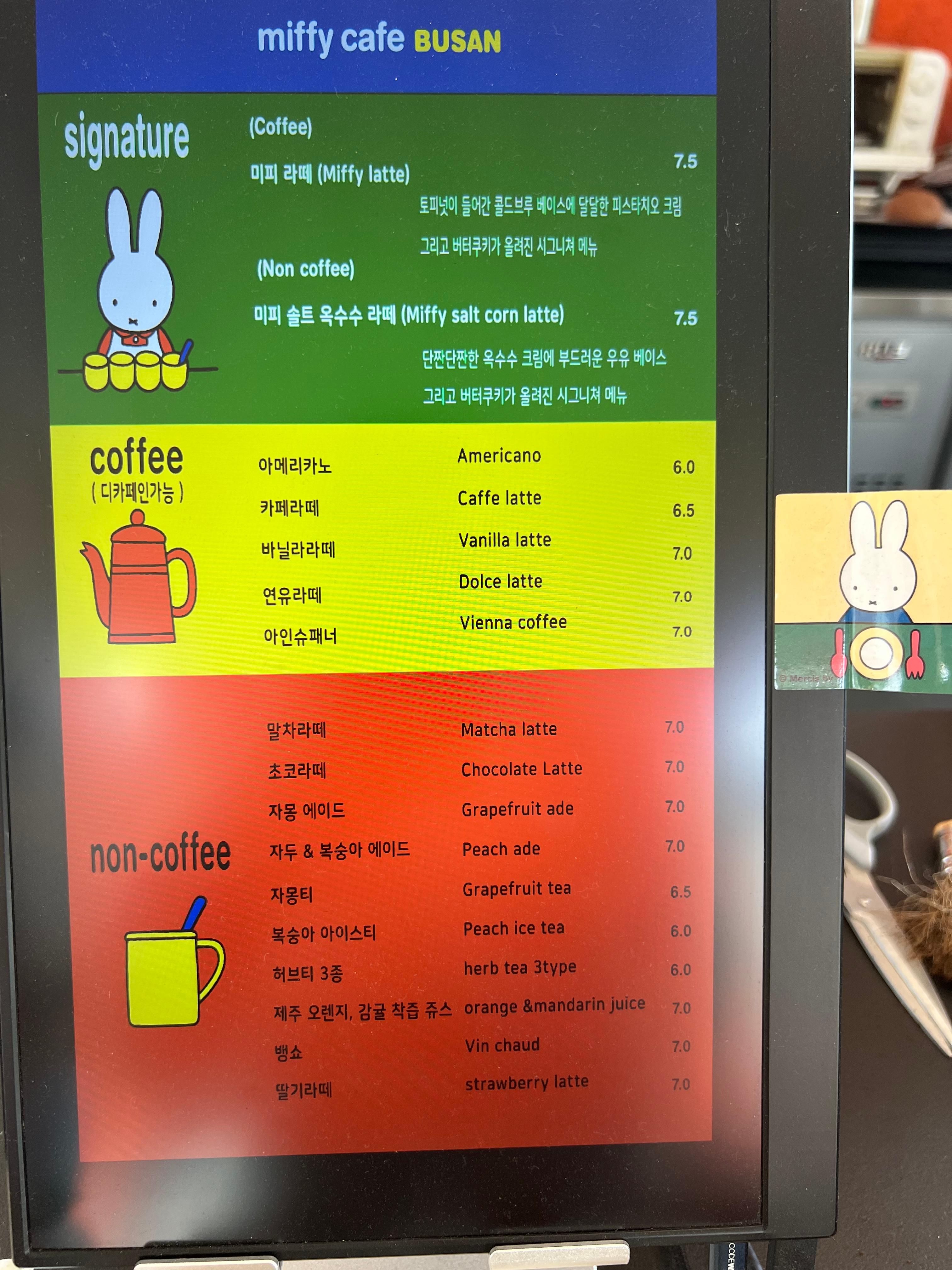 메뉴판도 귀여운 미피 일러스트로 꾸며져 있어서 보는 재미가 있었어요. 주요 메뉴는 다음과 같습니다.