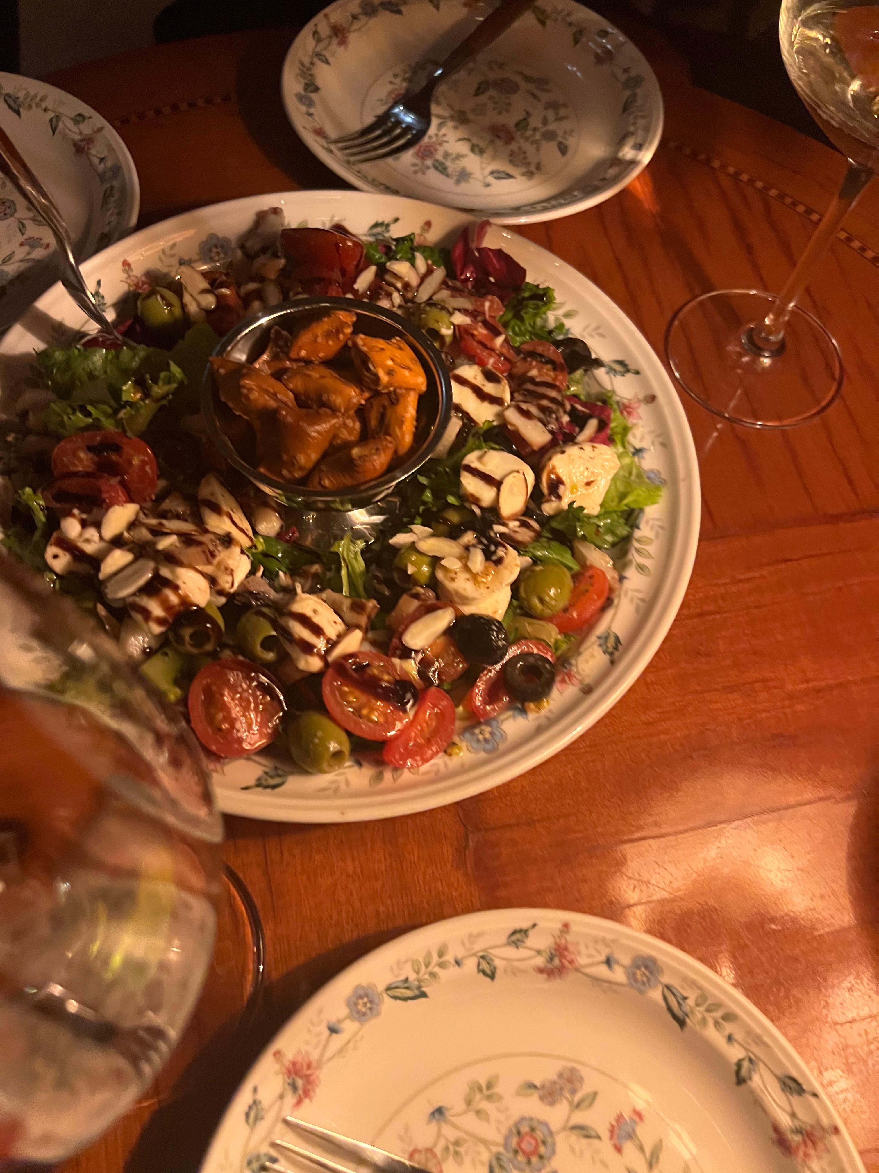 신선한 토마토와 모차렐라 치즈, 바질 위에 부드럽고 촉촉한 가문어가 얹어진 샐러드입니다. 올리브오일과 발사믹 소스로 마무리되어 상큼함과 감칠맛이 조화를 이룹니다. 샤르도네 와인과 함께 먹으면 더욱 풍미가 살아납니다.
