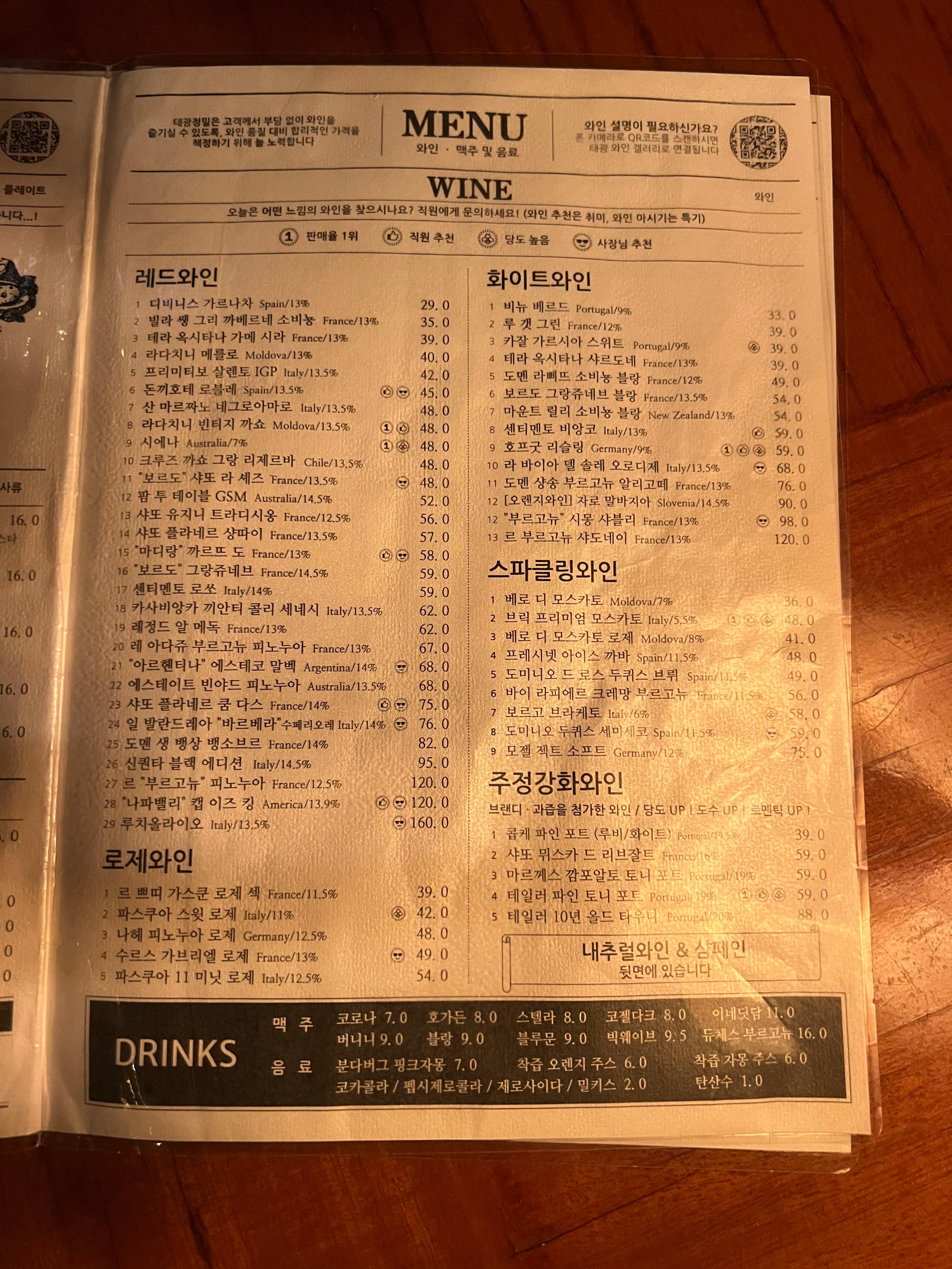 - 카살가르시아 와인 (₩39,000): 새콤달콤한 맛이 특징인 이 와인은 알코올 도수 9도로, 가벼운 음료 같은 느낌을 주지만 은은한 취기를 선사합니다.