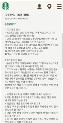 - 내용: 제조 음료 포함 20,000원 이상 구매 시, 스타벅스 로고 머그컵(Tall 사이즈) 선착순 증정